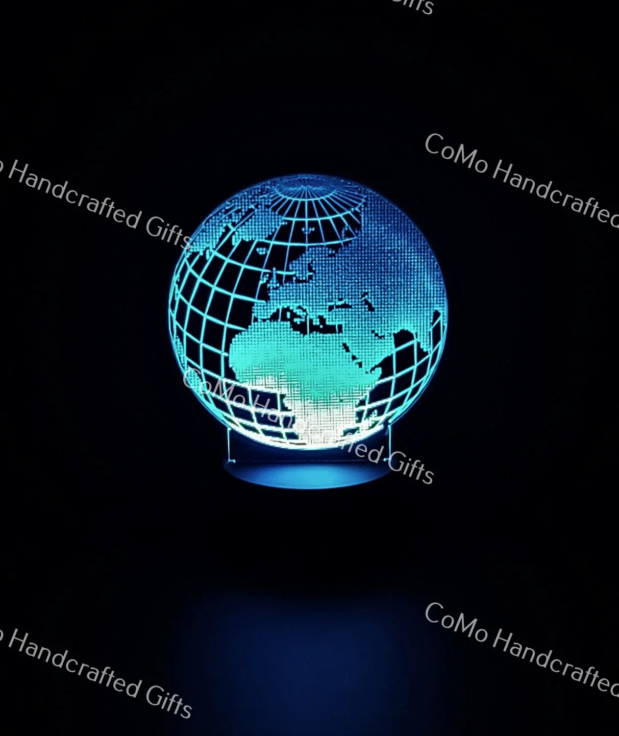 Edge lit laser engraved acrylic Globe lamp with circular LED light base featuring 7 colors and a touch switch to choose between functions (fast changing between all colors, slow changing between all colors, or choosing individual color). Light base powered by USB cable (provided) or 2-AA batteries (not provided). Dimensions: 7.75” tall x 5.75” wide.